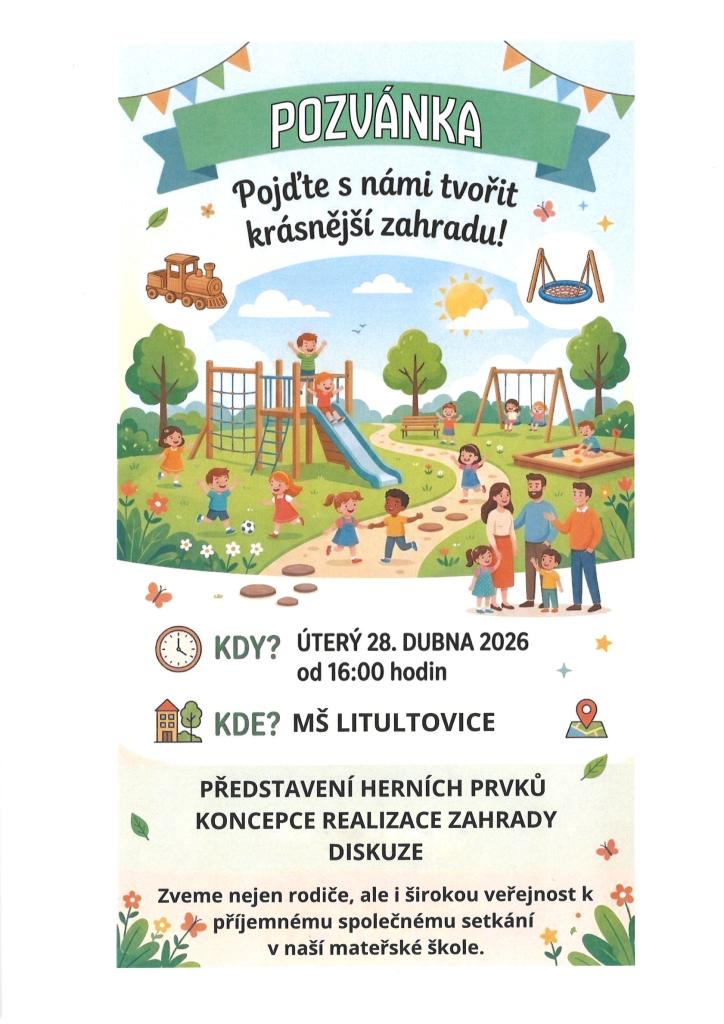 Pozvánka do Mateřské školy Litultovice v úterý 28. dubna 2026 od 16:00 hodin na představení koncepce realizace obnovy zahrady u mateřské školy.