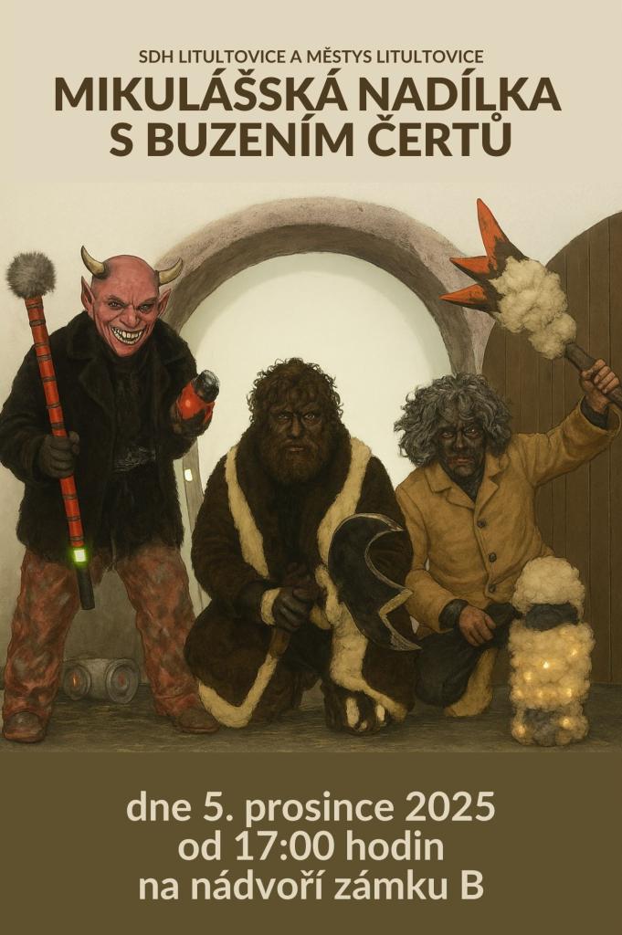 SDH Litultovice a Městys Litultovice Vás zvou na Mikulášskou nadílku s buzením čertů dne 5. prosince 2025 od 17:00 hodin na nádvoří zámku B.